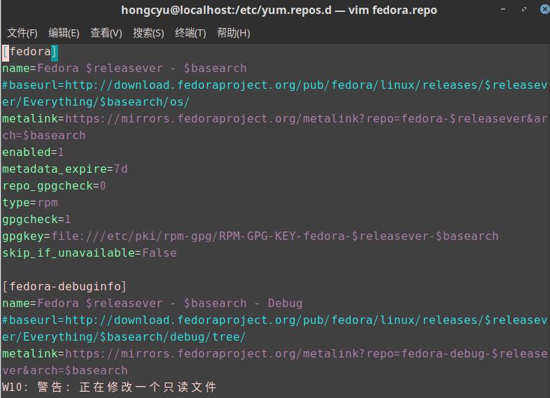 遇到不可保存的情况可以使用 $ sudo vi fedora.repo 来进行编辑,之后类似。