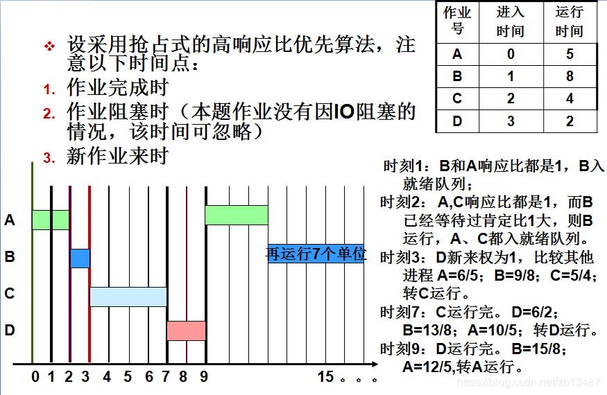 HRRN为每个作业引入动态优先权,使作业的优先级随着等待时间的增加而以速率a提高:优先权 =(等待时间+要求服务时间)/要求服务时间= 响应时间 / 要求服务时间。