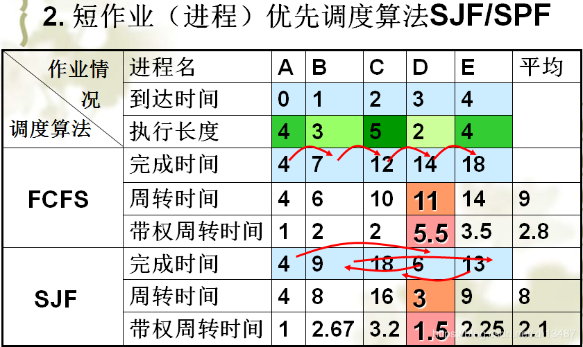 1.平均周转时间、平均带权周转时间都有明显改善。SJF/SPF调度算法能有效的降低作业的平均等待时间,提高系统吞吐量。
