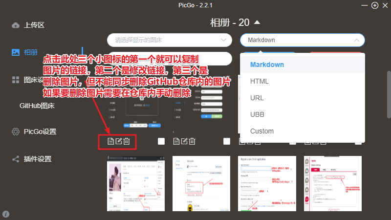 注意:上传前注意选择链接格式,当然也可以不选择,可以去相册选择图片的链接格式,如下图所示